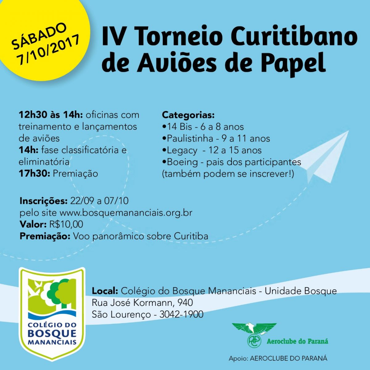 É o IV Torneio Curitibano de Aviões de Papel, idealizado e realizado pelo Colégio do Bosque Mananciais e aberto ao público externo.