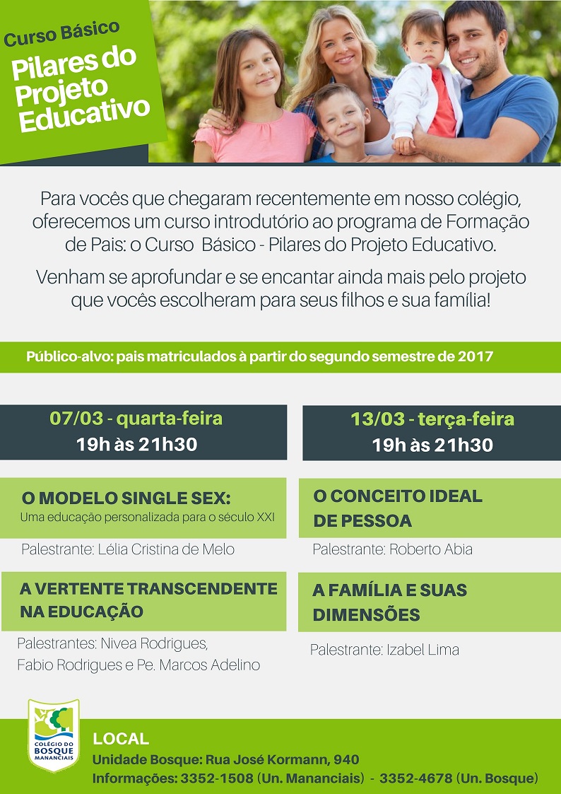 Os pais que matricularam seus filhos no segundo semestre de 2017 e em 2018 no Colégio do Bosque Mananciais serão recebidos a partir desta quarta-feira (7) para o Curso Básico: “Pilares do Projeto Educativo”. Em dois encontros, o primeiro nesta quarta e o segundo na terça-feira (13), sempre das 19h às 21h30, acontecerão palestras com temas referentes aos principais pilares do colégio.