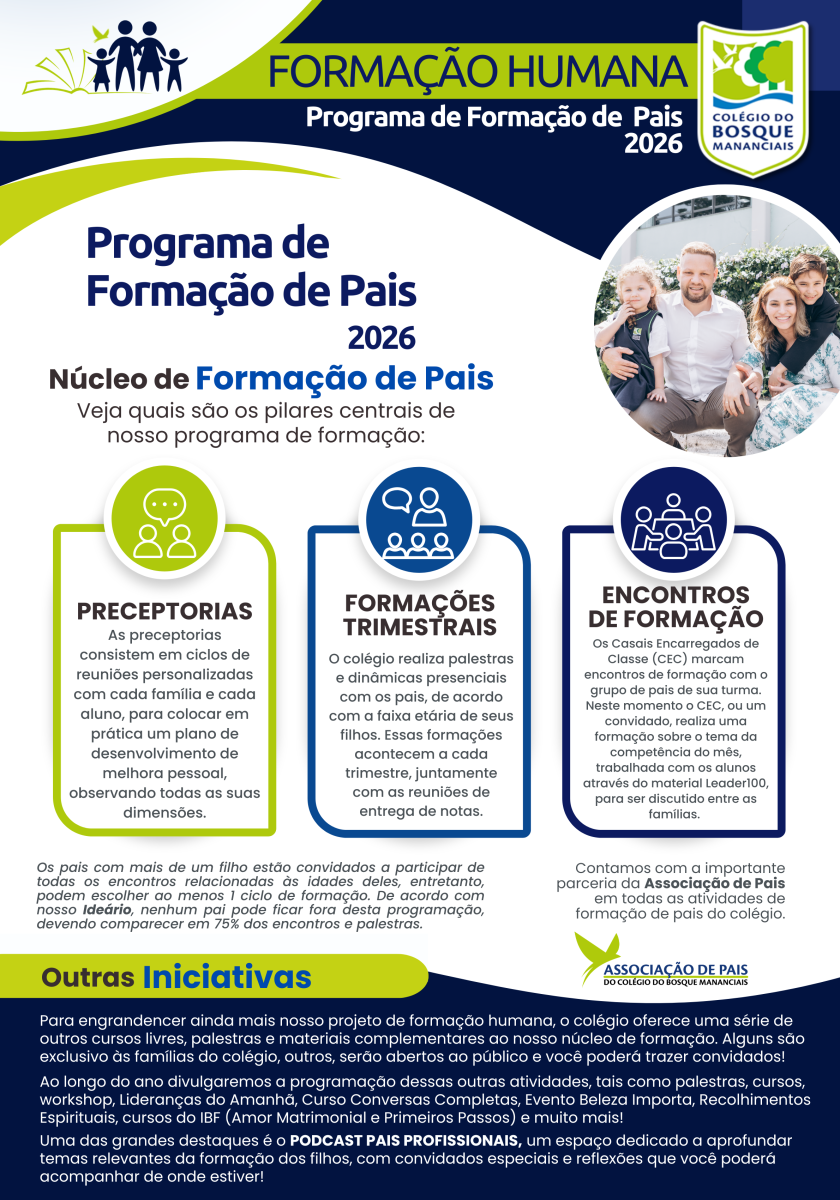 Dessa forma, o Colégio do Bosque Mananciais busca oferecer às famílias um caminho contínuo e estruturado de formação, em sintonia com seu projeto educativo e com a missão de formar pessoas livres, responsáveis e comprometidas com o bem.